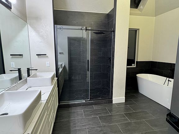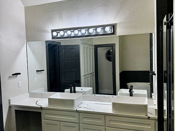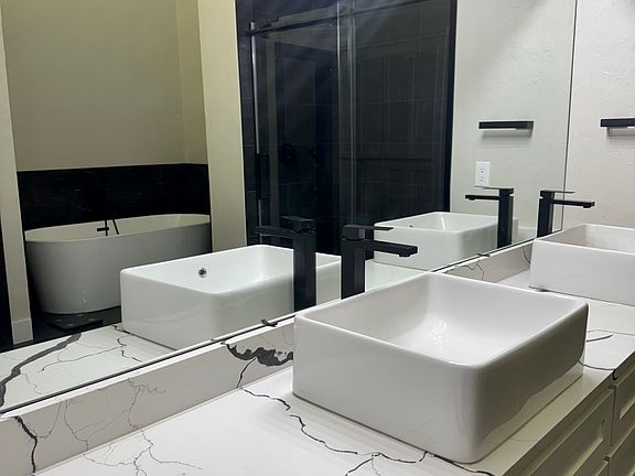 Step into style and comfort in this beautifully remodeled 4-bedroom, 3.5-bath home with a dedicated office and a spacious 3-car garage. From top to bottom, this home has been thoughtfully updated with modern finishes and high-end touches that truly set it apart. Inside, you'll find quartz countertops, new cabinetry, luxury flooring, and fresh paint throughout. The oversized, spa-like primary bath features a stunning free-standing tub perfectly positioned beneath a large picture window that frames peaceful views of the wooded landscape behind the home, an extra-large walk-in shower with individually controllable body sprayers, and designer tile work that gives it a boutique-hotel vibe. Every detail has been considered, from the vessel sinks and matte black fixtures to the custom handmade staircase railing and all-new doors and trim. The modern kitchen boasts new appliances and flows into an open-concept living area with a striking fireplace in the formal dining area perfect for entertaining or cozy evenings in. Step outside to a freshly fenced backyard offering privacy and space for outdoor gatherings or peaceful mornings with coffee on the new deck overlooking your wooded view. This home blends elegance with everyday functionality truly a turnkey opportunity for anyone looking for a fresh, modern space in a quiet, well established Edmond neighborhood. Tenant is responsible for all utilities and lawn care