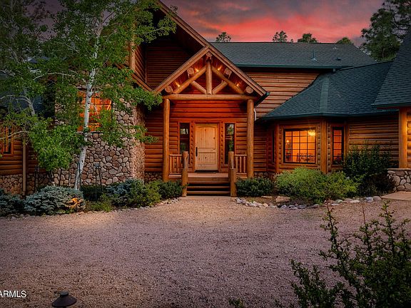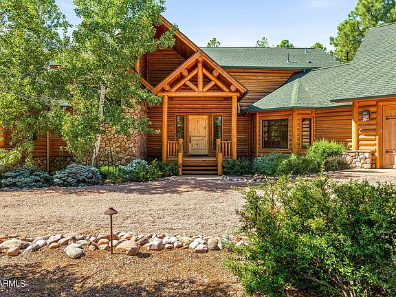 Lovely 3 bed + den, 2.5 ba CUSTOM BUILT escape in the pines! Great curb appeal with tree lined driveway, log siding, and stone accents. Featuring airy vaulted ceilings, bright natural light, rustic log walls & plank wood ceilings t/o, and a STUNNING stacked stone fireplace in the great room. Kitchen features knotty maple cabinets + pantry for storage, center island w/ breakfast bar, wall oven, and granite counters. Den w/ built-ins + formal dining or versatile flex space. Downstairs master exits to the deck and offers his & hers walk-in closets, dual vanity, separate shower & soaking tub. Generously sized secondary bedrooms & full guest bath upstairs. Expansive covered back deck w/ views of national forest land. Energy efficient construction. Great location in GATED Torreon in Show Low