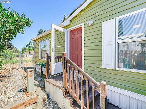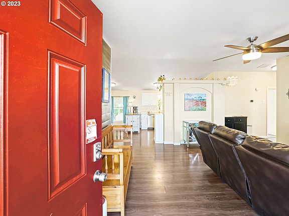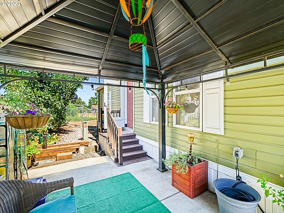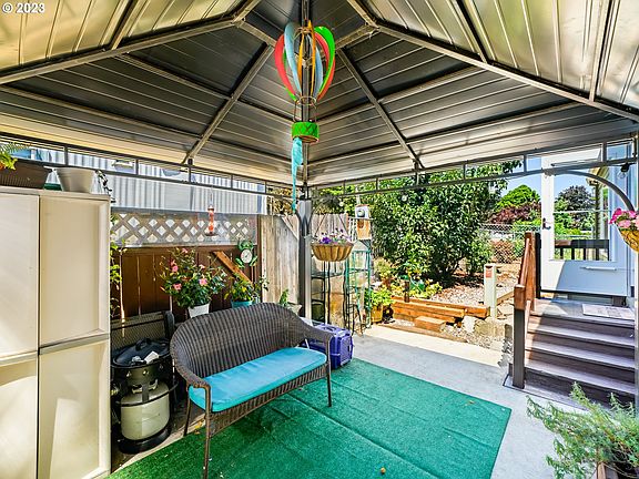 1232 sq ft 3 bed 2 bath home on large lot in Country Mobile Estates, just south of Gaston with seasonal views of wetlands and rolling hills. Open floor plan with light and bright updated kitchen, pantry, SS appliances, mobile eat bar that seller may leave. Oven, microwave and dishwasher are less than 1 year old. Updated bathrooms, paint and flooring throughout. Large primary bedroom with ensuite bathroom, walk in closet and slider to back deck. 2nd and 3rd bedrooms are at the opposite end of the home. Laundry room has exterior door to back. Large fenced back yard with sheds, picnic/fire pit area, backs to large open greenspace and extensive landscaping including, roses, hydrangeas, lilacs and large grapevine. Fenced in front yard with Gazebo over concrete patio, ample parking. Not far from downtown Gaston, post office, restaurants, grocery and Hagg Lake. Park Rules & Regulations and Park Application available from Park manager upon request. Sale subject to park application approval. Space rent $675/month.
