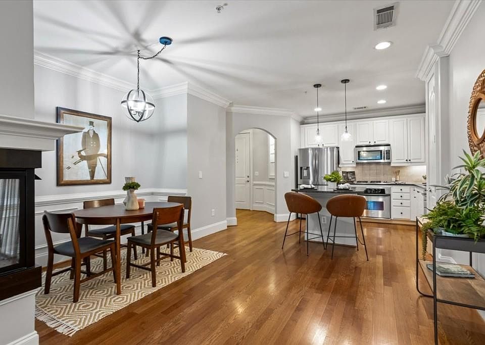 Welcome home to Sterling of Dunwoody! This immaculately maintained spacious 2 bedroom, 2 bath unit features rich crown molding, hardwood floors, and a lovely sunlit open floor plan. The great room and dining area feature a charming three-sided fireplace, and there's a bonus nook perfect for a home office which leads to your private balcony. The kitchen features white cabinets, granite countertops, stainless appliances, gas cooktop, a pantry, and an island for additional prep space and seating. With new paint throughout, it's a split bedroom plan - a spacious primary suite with a well-appointed spa-like bath and large walk-in closet, and a separate large guest room with its adjacent bath. Unlike some other units in the complex, the laundry is tucked away in the hallway instead of in the kitchen - a major benefit! What's more, this is the only unit currently available with a private wooded view from the great room and bedrooms instead of looking at the parking lot or swimming pool. There's one deeded under building parking space as well as a roomy storage unit. Gated Sterling of Dunwoody has wonderful amenities including a pool, clubhouse, gym, community garden and patio area with gas grills. It's literally a few steps to Brook Run Park, and is situated in great school districts conveniently close to all major highways - it's just a short drive to all the wonderful shopping, dining, and entertainment options in Dunwoody, Chamblee, the Perimeter Mall area, and Buford Highway.
