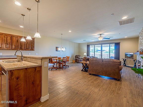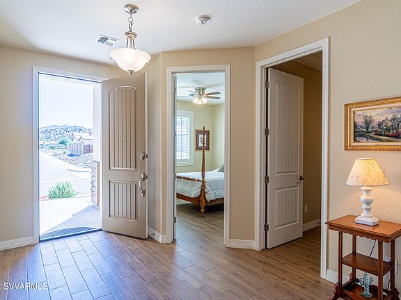This home is STUNNING and practically brand new. *PRICED TO SELL* This is an Energy Star home rated at just 25 out of 150. All appliances are smart appliances and home is equipped with fire suppressant sprinklers. Bright and open floor plan with tile wood plank floors throughout and floor to ceiling slate electric fireplace. Kitchen is a Chef's dream with gorgeous tile backspash and all the space you could want for prep and storage, soft close cabinets, Granite counters and gas range. Spacious master bedroom with huge walk in closet, his and hers sinks and walk in shower. Backyard has easy maintenance landscaping with relaxing views of Mingus and Sedona mountains - No Neighbors in the back!! 3 car tandem garage and access gates on both sides of the yard. SOLAR IS OWNED!