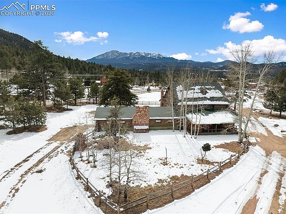 Welcome to Rampart Ranch, once known as Herman's Youth Ranch before it was subdivided, in addition to the original "Mountain Home Furniture" The history of this epic log home tells us 2 potato farmers hand built the homes in 1936! This is a stunning mountain retreat setting in Woodland Park just minutes into downtown! The historic property includes two homes built in 1936 & owned by the Williams family for the past 50+ yrs. The 4.84 acre property features a 4,764 sq ft log main home + an additional 2 bedroom log cabin at 1,026 sq ft. The uses, availability & versatility for multi-generational living, rental income, or private guest accommodations abounds on this homesite! The property benefits from the convenience of both well water & public water, a rare & valuable commodity. The zoning is agricultural, horses can be grazed w/ the benefits of a beautiful grassy yard! Great location just minutes from Woodland Park amenities & amazing Pikes Peak views from the front of each home! This is a one-of-a-kind opportunity you won’t find again. The main home features original wood flooring, large wood fireplace located in the living room, w/ soaring ceilings & the loft overlooking from the upper level bedrooms. An adjoining living space, 714 sf ft closed-in solarium includes flagstone flooring & is heated with a gas converted insert stove, wall of windows capturing Pikes Peak views & Southern exposure! Another addtn to the home, the Annex room, was added to the main home encompassing 1800+ sq ft which was known as Mountain Home Furnishings & brings many fond memories for long time residents of the area. The opportunities are endless! 3 upper level bdrms served by a full bathroom, while the uppermost level, attic space, was finished for additional living space, including a 1/2 bath plumbed for a shower. A second cabin including 2 bds, 1 bath has been a long-term rental for many yrs. & is served by separate gas electric meters. Come see this exceptional opportunity!