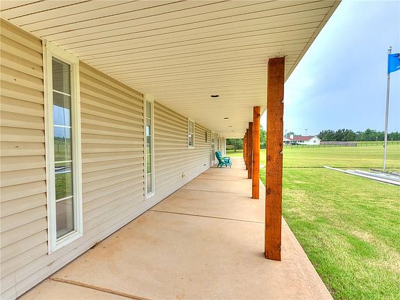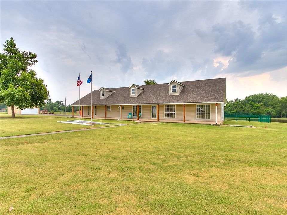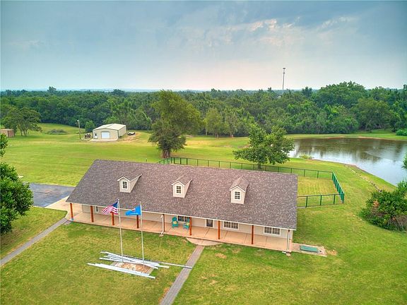 What a fantastic find! Peaceful, country living. Remodeled including: wood floors, inside walls, ceilings paint including all cabinets; house and gate house roofs (2021); new vinyl liner on the in-ground pool; vinyl siding on gate house; 30 x 50 metal heated/cooled shop building (far east building); 20 x 20 metal 2 car detached garage; 2nd 30 x 50 metal heated/cooled building with bathroom (front building); remodeled 28 x 20 one bedroom, one bath gate house with kitchen and living area; storm shelter (south side of the home). From inside of the home there is a beautiful view of the pool with a lovely lake and woods running along a babbling creek in the back ground. 220 RV plug-in's are in the detached garage and west shop. Large inside utility room just off the kitchen. The sprawling, covered front porch is gorgeous! Don't miss the opportunity to live just outside the Oklahoma City limits on an acreage with endless possibilities!