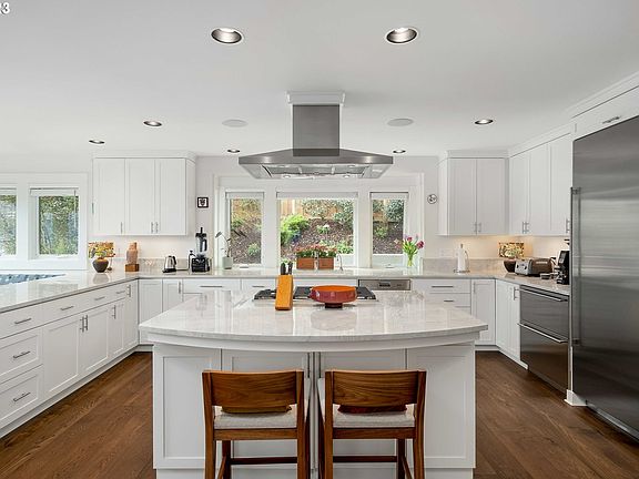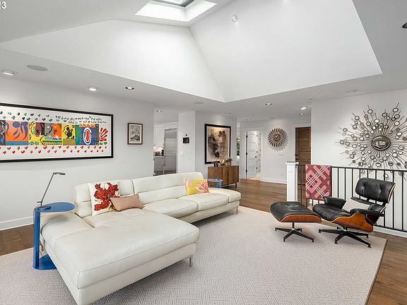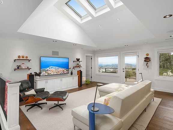Perfectly positioned on a quiet cul-de-sac street in Portland Heights this newly built home features both privacy and spectacular mountain and downtown skyline city views from nearly every room! The immaculately designed interior boasts a functional, modern floor plan with unparalleled attention to detail. The stunning chef's kitchen with a grand eating island and built-in breakfast nook seamlessly flows to the formal dining and living rooms with an expansive covered view deck. The beautiful primary suite on the main level is a true oasis, complete with an en-suite spa-like bathroom and a walk-in closet. Downstairs you will find 3 additional bedrooms, two bathrooms and a spacious family room complete with a wet bar, gas fireplace and a second refrigerator. An abundance of storage can be found throughout the home. The beautifully landscaped exterior features a large entertaining patio, a fully fenced yard with raised garden beds, fruit trees, a water feature and exterior accent lighting. Attached two car garage plus additional off street parking (3+ spaces). Mere minutes to NW 23rd, downtown, OHSU and easy access to the Markham trail system. This truly is an exceptional view property in the perfect location! [Home Energy Score = 4. HES Report at https://rpt.greenbuildingregistry.com/hes/OR10213284]