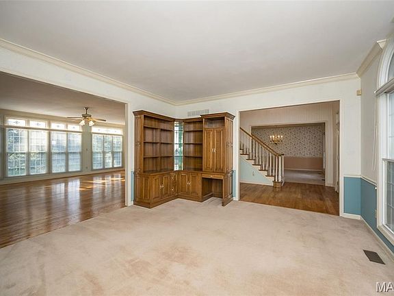 Located in Dunhill, the circle drive and beautiful curb appeal welcome you home. Leaded glass entry doorleads to a 2 story foyer with hardwood flooring. There is extensive crown molding, palladian and transom windows add architectural flair. The game room addition could be an amazing man cave that's not a cave at all, flooded with nautral light and a gas fireplace for cooler days. The family room has another fireplace, built in shelves, transom windows, wet bar and hardwood floring. You'll love spending time in the kitchen with an inviting 4 season room to enjoy every seaon. A rear stair leads to the second level, with hardwood flooring running the hall and into the primary suite. Rest and relax! Tray ceilin,g ensuite bath with tub, separate shower and a commode room complete with a bidet. 2 additional bedrooms share a jack and jill bath, the 4th bedroom is ensuite, a second primary suite guests or your favorite child! The lower level is versatile, with a huge office space, a rec room with fireplace and a walk behind bar. There's a cedar closet, a hobby room and a workshop area, definitely room for everyone and enverything here! The brick patio spans the back of the house and overlooks lush landscaping and a gorgeous yard. This beautiful Clarkson Valley home has easy access to all that Chesterfield Valley has to offer. Rockwood schools, award winning Kerhs Mill Elementary, and easy highway access. New roof August this year, inground sprinkler system.