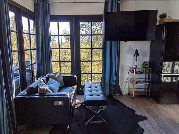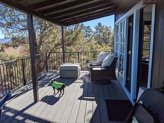 Super cute detached very private guest house located on a private road with it's own private large paved driveway close to Thumb Butte. The house is fully furnished (can be rented unfurnished), with a comfy queen sized bed, huge TV, nicely stocked kitchen, great deck with fantastic views, stackable washer and dryer in bathroom. High speed Internet, water and trash included. Backs up to National forest with hundreds of miles of trails just outside your front door. 2 miles from downtown Prescott. 1 year lease is preferred. No smoking. Owner pays for water, trash and high speed internet.