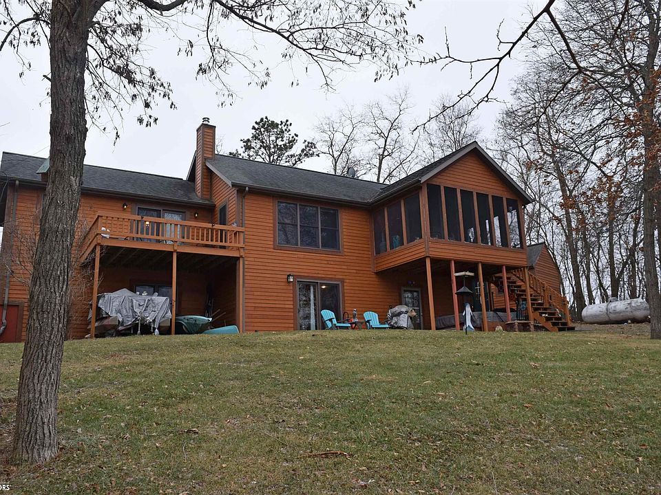 Waterfront getaway for weekends or the perfect year around residence. Living room has big windows to take in the water view. Large bedroom suite on main floor, with deck looking down to your private fire ring by the water. Second bedroom suite in lower level, along with a rec room that walks out to lake. Enjoy the four seasons of Iowa from the patio, hot tub, and screened in three season porch. Snuggle up to the wood stove in lower level on wintery days. Open concept kitchen with large island -with seating, large dining area, convenient powder room near garage entry and main floor washer & dryer. Great space for office and lots of storage in lower level. Very private neighborhood. Walk across the road to the Walton golf course or drive your golf cart over to the club house for dinner. 2-bedroom suites, and two additional half baths equals 4 total baths. Matching storage shed for toys. And newer outdoor hot tub. There's no competition for this waterfront property!
