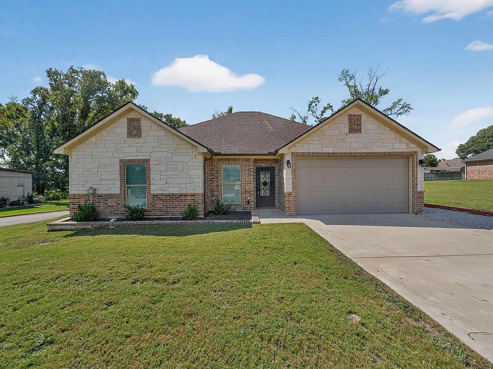 Welcome to Your Lindale Dream Home! Step into a thoughtfully designed open-concept living space adorned with high-quality finishes, including tiled floors and crown molding. This home offers four spacious bedrooms, arranged with privacy in mind. The primary suite is a true retreat, featuring a spa-inspired bathroom with a separate shower and a generous walk-in closet. A split layout also provides an additional guest room tucked away from the other bedrooms—ideal for visitors or multigenerational living. The chef’s kitchen is equipped with granite countertops, a farmhouse sink, stainless steel appliances, and a refrigerator that remains with the home. A dedicated laundry room adds convenience with ample cabinetry and a sink. Energy efficiency is built in with spray foam insulation, while the exterior showcases timeless curb appeal with all-brick construction and stone accents. Outside, enjoy a large backyard on a corner lot, perfect for entertaining, play, or relaxing evenings. Don’t miss this opportunity to call Lindale home—where modern comfort meets a prime location. Some rooms have been virtually staged.