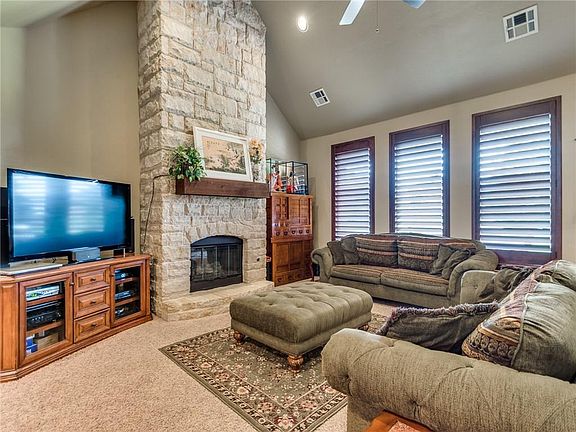 Back on Market! Immaculate home in gated community in Deer Creek Schools. Cathedral ceiling in living Room, Stone fireplace, and Plantation shutters. Crown molding in formal dining, kitchen and eating area, study, and master bedroom. Study could be 4th bedroom. Kitchen equipped with brick accent wall, large island provides additional storage, granite counter tops with tile backsplash, and stainless steel appliances. Kitchen is open to the living area. Spacious master bedroom with ceiling fan. Master bath features jetted tub, separate shower and large master closet with built ins. Upstairs bonus room with adjacent full bath. Secondary bedrooms downstairs with Jack and Jill bath. Huge backyard facing East for pleasant outdoor activities. In ground storm shelter in garage floor. Close to Prairie Vale Elementary. Two neighborhood ponds. You won't be disappointed with this fantastic property.