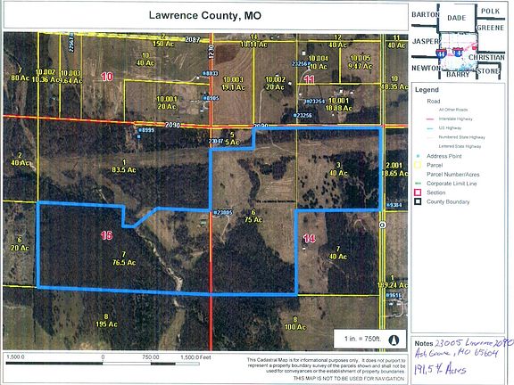 This Wonderful 191.5 +/- acres is conveniently located just south of I-44 off of O highway in Eastern Lawrence County. This property offers a great balance off both mature timber and open pasture ground with good fence and cross-fencing. The clear Goose Creek runs through the property from South to North and is fed by 2 year-round springs in the heart of the property. A 50' x 80' red iron hay barn, 42' x 30' equipment barn, 2 car detached garage and 2-bedroom farm house. The home features a Wood-burning fireplace, Propane wall heater and furnace, electric appliances and updated wiring, service panel, covered front porch and metal roof. Situated at the end of a private drive off of 2090 this property offers plenty of privacy and hunting opportunity.