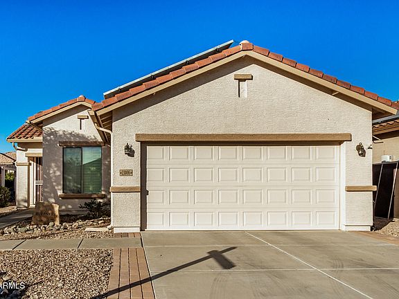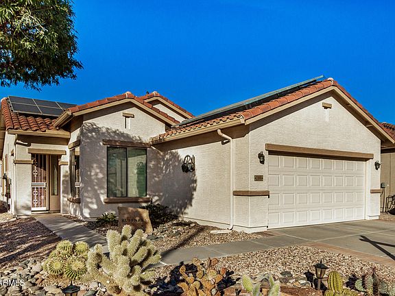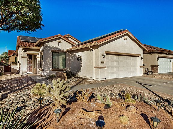 Welcome to your beautifully cared for 2/2 home. You are sure to love the the original owner's care with maple cabinetry; Corian countertops; roll-out shelving; oversized tile and 3'' baseboards; additional entertainment center lighting; extended garage with epoxied floors & 2 security doors Enjoy outdoor living w/ your beautifully landscaped yard including pavers, synthetic grass, screened Arizona room, pergola, and fully fenced yard ready for your furry friend. Energy savings to be had with ceiling fans, plantation shutters, sunscreens, fully PAID SOLAR lease. Highly desirable community for its beautiful 18-hole Championship golf course, vibrant activity center, proximity to shopping, restaurants, medical and freeway access. ***Professional PHOTOS Coming Soon!*