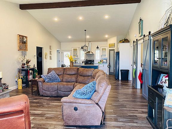 Custom built home in 2020 on 5 acres. This open concept home offers vaulted ceiling’s for the living, dining and kitchen area. 3 bedrooms 2.5 bathrooms has divided bedroom plan, master suite w/ walk in shower and double vanity. Bedrooms 2/3 offer walk in closets, Jack and Jill bathroom. Family/Game room area. Oversized 2 car garage and John Deere room for additional storage.