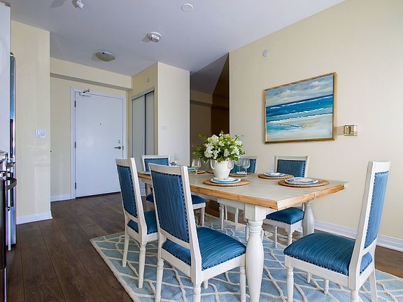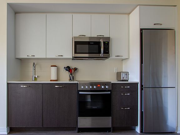 Great Location in Danforth Village, steps to TTC, GO Transit and shopping. Completed in 2020, this a 4th floor, 1 bedroom + den, south facing unit, w/ floor to ceiling windows, fully self-contained, bedroom features a walk-in closet and blackout blind, UV blind in the living area. Stainless steel appliances, Moen faucets w/ a pull-out sprayer in the kitchen and granite countertops in the kitchen and bathroom. The terrace provides 127 sq ft of outdoor space. Freshly painted. Building features a gym, Yoga studio, lounge w/ fully equipped kitchen for events, dog wash, bicycle racks and a rooftop terrace with a fireplace lounge, BBQs & dining area, sunbeds and spectacular views of the city. Pet friendly, no smoking inside unit, smoking on the terrace is ok. Utilities are not included, hot water and cold water are billed separately. Building retains heat well so minimal heating is required. Heat pump quickly cools the unit. $25 key deposit. Tenant is responsible for maintaining unit in move-in condition. Landlord supplied filter in heat pump must be changed every 3 - 4 months. Unit includes optional area rugs, a Shark upright vacuum and a WetJet mop for the hardwood laminate floors