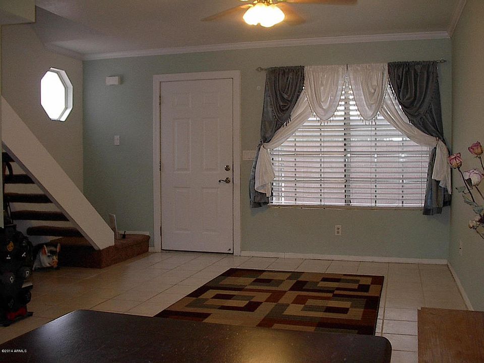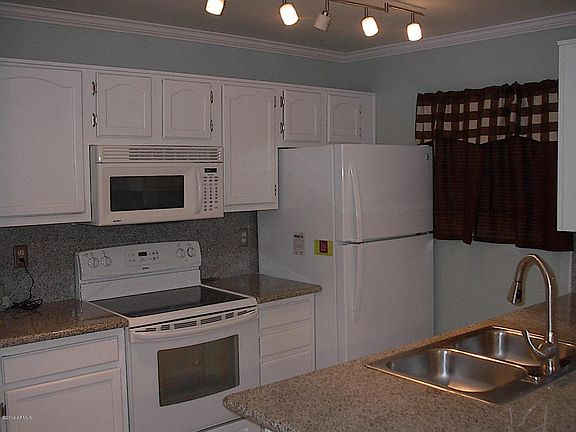 Price reduced! Gorgeous townhouse - all appliances convey! Kitchen features granite counters and back splash, track lighting, frig under a year old, oven/stove & dishwasher & fixtures less than 3 years old, spacious pantry. A/C installed in 2011, new roof in 2012. Has crown molding, indoor laundry, ceiling fans throughout, abundant storage and super-secure storage room (w/custom steel doors). Upgraded paneled doors. Recently installed smoke detectors. Newer sunscreens, water heater, and security door. Tile downstairs & in bath, carpet in hall and bedrooms. Playground area right across the street. Two community pools and spa. Assigned covered parking spot and lots of unassigned parking available. Short drive to US-60 and 202.