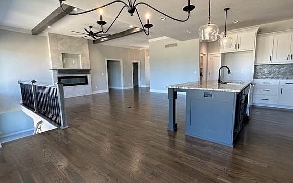 The remarkable "Maplecrest II" reverse was built by NTJ Builders. Walk into this beautiful well desired reverse floor plan, the main level flows openly. The great room is spacious with beams, a wood floor, and a fireplace. An abundance of windows on the back side of the house, and a covered deck for entertaining off the kitchen. A large island, walk-in pantry, drop zone, custom cabinets, and granite countertops. The Owners-Suite with a walk-in closet, shower, and double vanity in the bath. The main level also offers a second bedroom and full bath on the main level. Down on the lower level, you will see a beautiful wet bar and a family room. Bedrooms 3 and 4 along with a third full bath. Need storage space? No problem this home has that too! Walk out to a full-length patio for grilling or simply sitting and enjoy! Walk to the city's 4-mile walking trail and community pool.
