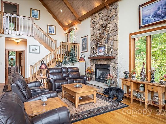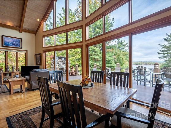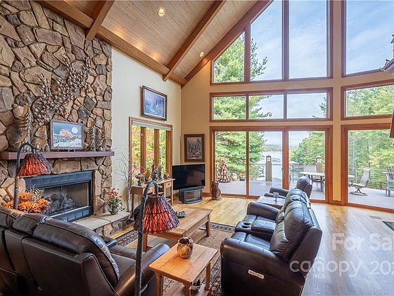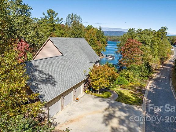 Exquisite Lake James custom home, premier waterfront location designed with lake life in mind. Home features two story great room with wall of windows looking out at the lake, stone fireplace, custom kitchen, master suite with gas fireplace and bath with heated floors. Expansive deck overlooking lake and mountains. Upper level has two bedrooms, bath with heated floors and cozy office nook overlooking great room and lake. Lower level has family room, second kitchen, bath with heated floors, stone fireplace, pool table, custom bunk room. Walk-out to covered patio, with two story stone fireplace, and stone walkway to fire pit and easy walk to the shoreline. Private covered boat dock, with hydrohoist lift and jet-ski dock, Enjoy swimming and paddle boarding in the quiet cove off main channel. This home has a three car garage, plenty of space for all of your lake toys, is on 1.45 acres and has 270 ft of shoreline. Mallard Cove is a small gated community on the east side of Lake James.
