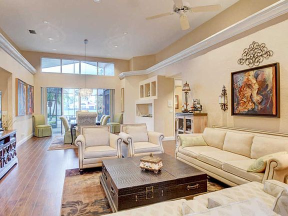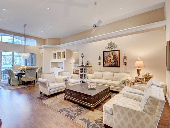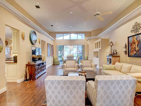 Santa Barbara dream home! Beautifully remodeled on one of the largest lake lots in community - Front doors open to spacious formal living/dining with volume ceilings, recessed lighting, Swarovski chandelier & sconce lighting - Gorgeous pool & lake views - Split bedroom floor plan for great privacy - Stunning Island kitchen, stainless appliances, soft close drawers, large pantry, double ovens, garden sink, Induction cooktop - Bar seating for 5 - Beautiful wood laminate flooring through most of the house - Spacious Master Suite with his/hers walk-in closets - Master bath has new custom vanity, double sinks, separate shower, Air tub - To enjoy the gorgeous setting, step out to huge covered porch and extended patio with new pavers, remote access pool lights & more! S-Tile Roof 2011