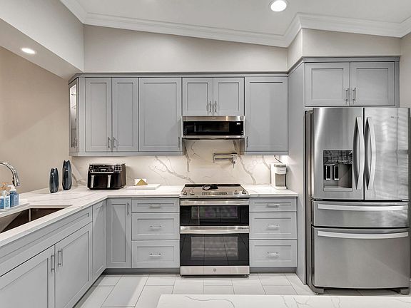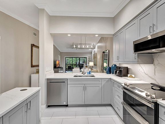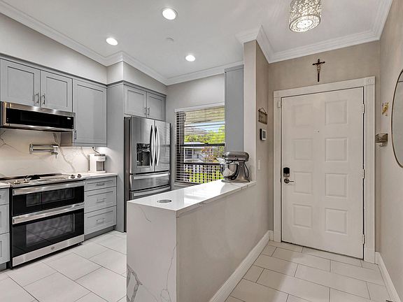 Imagine coming home to relax and unwind in your condo that belongs in ''Beautiful Spaces'' magazine! Completely renovated and updated with the finest decorator touches! Quartz countertops, abundant cabinets, gorgeous designer lighting, paddle fans and floor tile, it even has a pot filler faucet plumbed into the wall behind the stovetop! Split bedrooms, huge storage room, complete accordion hurricane shutters for piece of mind during storms. Full sized washer & dryer in the unit. Maintenance fee includes fiber optic TV and lightening speed internet! Pet friendly neighborhood allows one (1) pet, up to 50 lbs. The unit is steps away from the heated community pool, tennis, & basketball court. Zoned for excellent public schools. Easy access to I-95 & Publix. Owner motivated, bring offers!