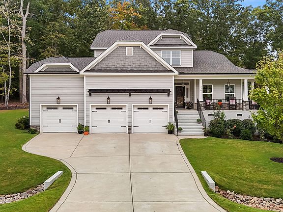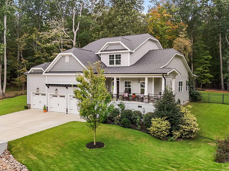 This 2,900 sqft beauty shows like a model home! Nestled on a half-acre cul-de-sac lot within minutes of Wake Forest, this property offers a 3-car garage - with the single bay currently transformed into the ultimate golf-themed ''man cave.'' Step onto the 25' wrap-around front porch and into a welcoming foyer that flows into the open-concept living space. The family room features a cozy gas log fireplace, while the gourmet kitchen shines with Granite countertops, a tile backsplash, under-cabinet lighting, a double wall oven, 5-burner gas cooktop, and stainless-steel appliances. A casual breakfast nook and eat-at bar make this kitchen the heart of the home. The versatile Carolina Room with access to the screened porch is currently used as a home office. The formal dining room is a showpiece with a stunning coffered ceiling and elegant chair rail molding. On the main level, the primary suite offers a trey ceiling, a walk-in closet with custom wood shelving, and a spa-like bath featuring a double vanity and oversized tiled shower. Upstairs, you'll find an open loft and three spacious guest bedrooms, each with walk-in closets. Engineered hardwood floors flow through much of the first floor, adding warmth and character. Outside, the backyard is fully fenced with 5' black aluminum fencing. The irrigation system and landscape lighting create unmatched curb appeal. This home is the perfect blend of comfort, luxury, and thoughtful design! MUST SEE!