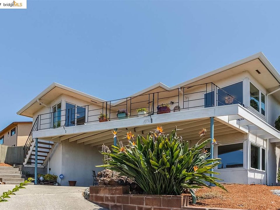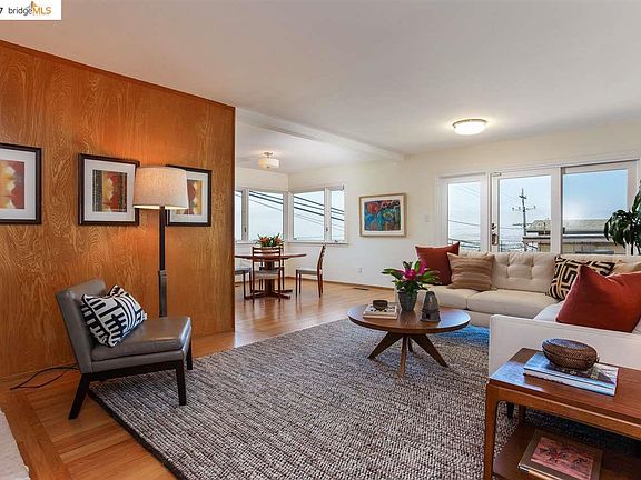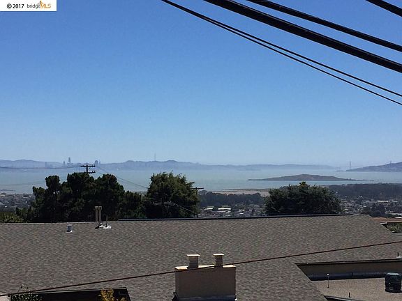 Located in the peaceful Mira Vista neighborhood, this warm and spacious level-in Midcentury home enjoys spectacular views from the Marin Headlands to the Bay Bridge. Excellent floor plan with updated eat-in kitchen, living and dining rooms, and three bedrooms, two baths including master suite, all on the main level. Sunny updated eat-in kitchen with pantry area and prep sink. Dining room with built-in cabinet and bay views Large living room with hardwood floors, raised hearth fireplace and big view deck. Three ample bedrooms with large closets, two beautifully remodeled baths, including master suite. Two-car garage with interior entry into kitchen. Huge downstairs rumpus room with bay view and separate entrance, perfect for au pair or potential Accessory Dwelling Unit. Upgrades include: dual-pane windows, seismic retrofitting, drainage system. Just a short drive to the El Cerrito del Norte BART, and San Pablo Ave. shops and restaurants. Zoned for Madera Elementary.