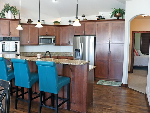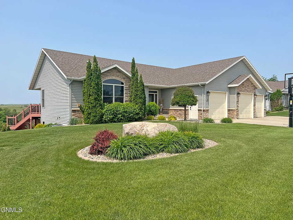 This is a must see!! Great location in a low traffic area. Completely updated throughout with a wonderful view. The updates are endless as soon as you enter the home. The main level has the primary bedroom with walk in closet and tiled shower. Custom Oak cabinets and sliding drawer pantry in the kitchen along with main floor laundry. Skylights and vaulted ceilings to enhance the daylight. Granite countertops throughout. Numerous windows on the main level to enjoy the beautiful sunsets. Attached maintenance free deck off the dining room with built in gas line for your summer grilling. Two more bedrooms and a full bathroom complete the main level. Head to the basement with 3 more bedrooms and a full bathroom. Complete wet bar with fridge and a walk out to the concrete stamped patio. Sound system throughout. Head out to the fully finished and heated 4 stall garage with epoxied floor and 3 separate drains for all the dreaded snow and ice melt. Hot/cold water with sink. Customized cabinets with stainless steal countertops. The yard is fully finished with a landscaping enhancement in 2022. Large driveway with an additional parking pad on the side of the home. Please refer to the List of Updates attached for the complete list of updates to the home. There were no shortcuts taken to prepare this home for its new owners. You don't want to miss this one, contact your favorite realtor today for a showing!