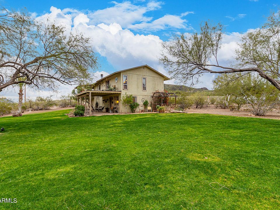 Check out these VIEWS! One of a kind 2.5 acre horse property features mountain views on all sides. Off the front circle drive, step into this charming home full of amazing features. The open concept living space has plenty of natural light, a suspended wood-burning fireplace, and wood accent walls. The HUGE split primary bedroom has vaulted ceilings, wood beam accents, a separate exit to the elevated back deck, walk-in closet, and full bath. The basement/first floor also includes its own entrance and another large living area and bathroom. The park like setting of the backyard is landscaped with mature native trees and a large lawn with freshly planted rye. The property includes a horse arena with lighting and four covered horse stalls as well as a 20x20 tack (storage) room... (cont.) In addition, there is a large covered barn space for RV parking, a firepit, and 300+ feet of park fence line. Owned solar panels mean LOW utility bills. The home backs to Thunderbird Conservation Park with access via gate RIGHT ACROSS from the home. This is a country dream in the heart of Glendale. From the moment you turn on Parkside, leave the city behind as you enter the quiet enclave. Close to shopping, dining, schools, and the AZ-101 for easy commuting. The property is able to be subdivided.
