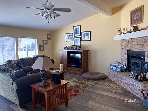 This home has everything that you have been looking for. This well cared for home sits on a park like, nearly 3/4 acre property with a view of the White Mountains. Large trees and open DWP land across the street lend to a very quiet atmosphere with no close neighbors, and how nice to have a stream in the front and along the side! The home opens into a spacious living room with plenty of room for dining. Enjoy mountain views while preparing meals in this kitchen with plenty of counters and island. 3.5 years ago the kitchen cabinets were painted and luxury vinyl plank flooring was installed in the kitchen, entry, family room, hallway, laundry room and both bathrooms. Primary Bedroom has an additional area that would be perfect for an office or sitting room with a slider out to patio. 5ft White vinyl fence is set 2 feet inside the property line and property extends approx 46 feet beyond the back fence. Property is zoned RMH 7200sq.ft. minimum. Home is sided with cement Hardie board. Set up a showing today for this beautiful home!