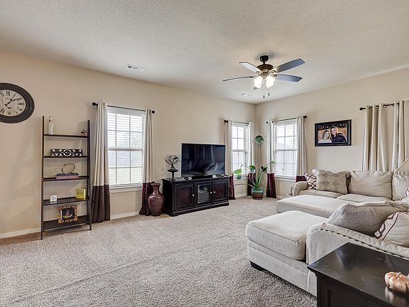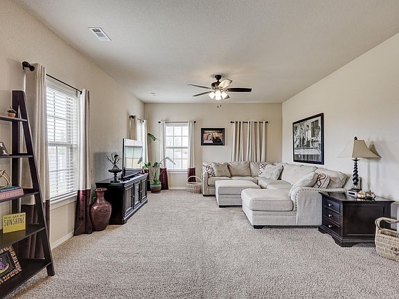 This Brick and Stone home features 3 bedrooms, 2 bathrooms and a bonus room, with a 2 car attached garage with in ground storm shelter. Its Beauty meets functionality with a split bedroom floor plan. Huge arched doorways lead You between living areas. Primary bedroom with trayed ceilings, ensuite bathroom and walk in closet. Outside you will see a covered patio and fully privacy fenced back yard. Home built in 2013 by Rauch Coleman Construction.