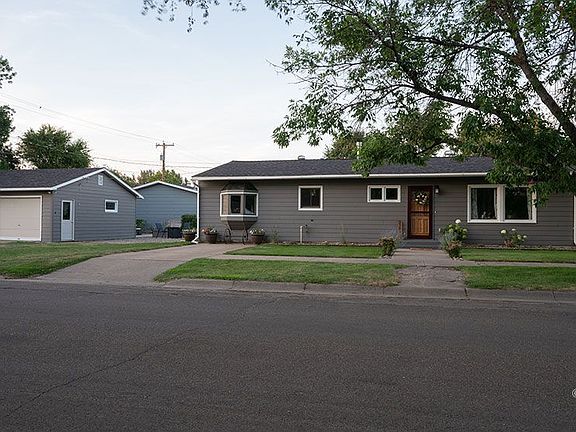 This beautiful home has been completely remodeled to the studs. It is a move in, one-level home with sunken family room. Featuring gorgeous laminate plank flooring, cool grey tones, and immaculate eat-in kitchen. It's open concept allows flow from the entry to the more formal living room to the kitchen and dining area as well as the more casual family room. Bedrooms are at the rear of the home, near the nicely updated bathroom with modern touches, and conveniently located near the laundry room. Both the roof and siding were installed in 2019. Besides the lovely interior finishes, this home rests on a large corner lot with underground sprinklers, large patio area for entertaining, fire pit area, raised garden beds and even a clothes line and cute chicken coup for getting back to nature. There is also a nicely appointed double car garage for our cold Eastern Montana winters, complete with work bench and tool storage. A desirable south side property out of the flood zone and move in ready, what more could you ask for!