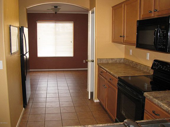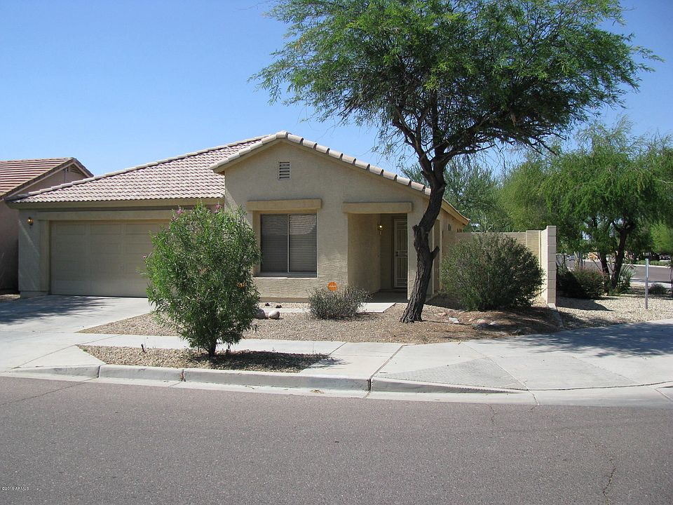This 3bedroom 2 bath home sits on a corner lot with north / south exposure. Property backs up to a common area that has desert landscaping. Home features a floor plan that offers a large kitchen, eat-in area, black appliances and opens to a great room. Ceilings fans thru out, custom paint, 2 inch faux wood blinds, tile and carpet. Extra wide garage and EZ to maintain desert landscaping with a touch of grass!!