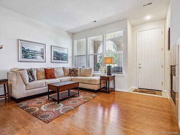 Absolutely gorgeous & updated 2 bedroom / 2 bath ground level condo in perfect "move in" condition in desirable Saddle Rock community! Enjoy entertaining and relaxing outdoors on the private 8 x 11 covered front porch right outside your front door. As you enter your home you will love the open contemporary design featuring 9' tall ceilings, 3 large living room windows with new blinds, beautiful laminate wood flooring and the gas fireplace with a built-in entertainment niche. The dream kitchen includes a pantry, granite countertops, crown molding, breakfast bar, newer Frigidaire Gallery Series refrigerator, 5 burner range and microwave plus a super quiet Bosch dishwasher! The LG washer and dryer are included in the laundry room that is thoughtfully located away from the bedrooms. The spacious primary suite has 3 windows, a tray ceiling & ceiling fan and private en-suite 3/4 bath. The secondary bedroom is an ideal spot for a study/home office or for guests and is conveniently located across from the updated full bath. Direct access just off the kitchen to your own oversized tandem 2 car attached garage that is completely finished and features 9.5' ceilings, a water hose spigot (to wash your car or dog) and additional space for storage or workbench. The community amenities are close to the unit and include the newly rebuilt swimming pool, hot tub, playground and the use of the Saddle Rock Community clubhouse! Amazing location within The Cherry Creek School District and close to Southlands shopping and restaurants, Trails, Saddle Rock Golf Course, E-470 for commuting to DIA, DTC, Parker and Colorado Springs. Vacant and priced to sell quickly!