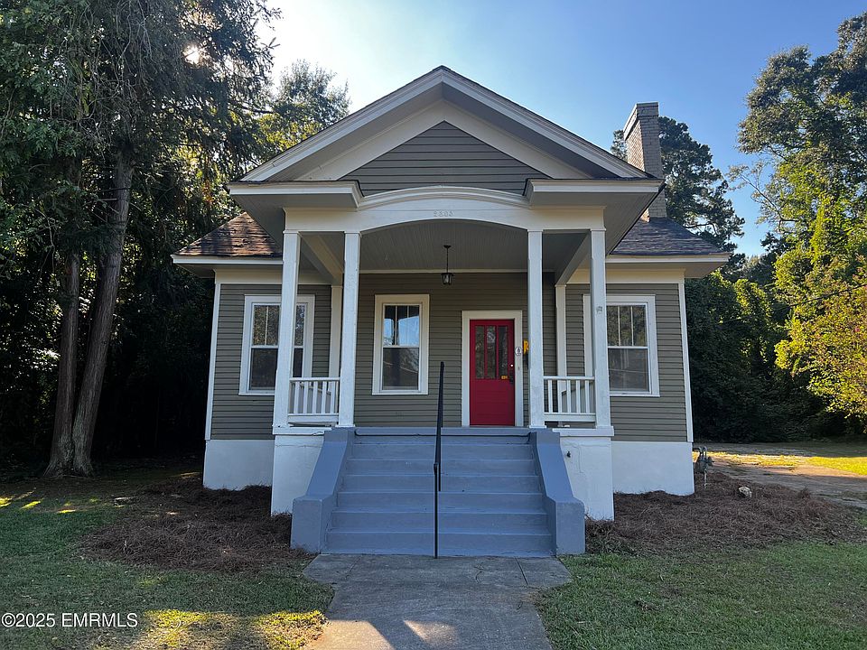 Charming wooden home previously used as a bed-and-breakfast, 2 bedroom, 2 bath with double lot. This home has personality and a quaint covered front porch. Laundry has a utility sink. The dining room, off the kitchen/breakfast nook, is open to the family room pictured with fireplace. Other features are sunroom, tall ceilings, hardwood flooring, breakfast nook, 2nd and 3rd pictured fireplaces, and pull-down storage. The inside and outside have been completed re-painted. The back has a breeze-way leading to more storage. Note radiator heat and one window unit.