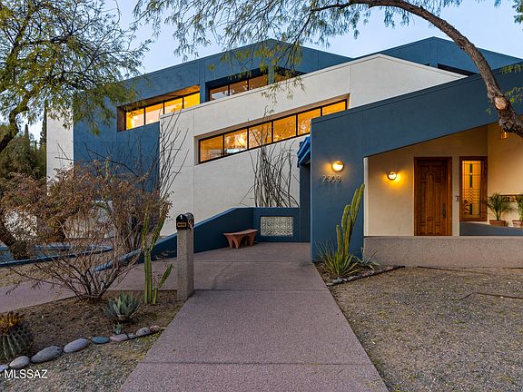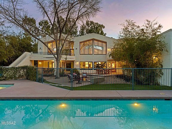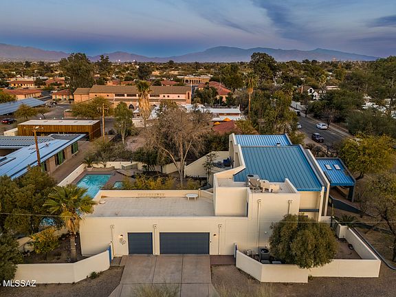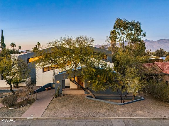 Nestled just a block from the historic Arizona Inn, this architect-designed contemporary home is a haven for admirers of mid-century and post-modern design. Situated on a generous corner lot, the property combines exceptional privacy with striking architectural features, including high clerestory windows that flood the interiors with natural light. The great room is a showstopper, featuring dramatic two-story, north-facing windows that offer panoramic views of the lush yard, lap pool, spa, and the majestic Catalina Mountains. Upstairs, the primary suite is a tranquil retreat, complete with a private balcony, a luxurious double shower, and an oversized walk-in closet. The first downstairs guest bedroom features a new ensuite bathroom, while the second guest bedroom has access to the updated hall bathroom, enhancing privacy and convenience. Designed for versatility, the home includes a library that can easily serve as a fourth bedroom and a bonus room off the three-car garage--perfect for a home office, gym, or hobby space (not included in the square footage). The chef's kitchen is thoughtfully designed, boasting a central island, walk-in pantry, appliance garages for clutter-free countertops, a Sub-Zero refrigerator, and a high-end stove. Whether hosting grand gatherings or enjoying quiet solitude, this home seamlessly blends elegance with functionality. Recent updates, including new A/C units and one new water heater, ensure modern comfort and efficiency. Don't miss this unique opportunity to make this dream home yours!