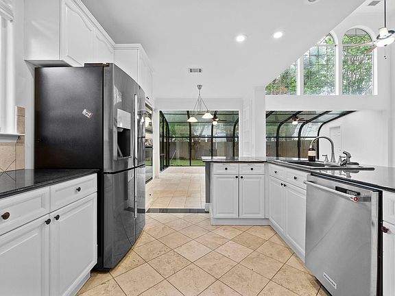 Home officeStainless steel appliancesCustom shadesGranite countertopsNatural stone travertine floorsNatural lightBright florals