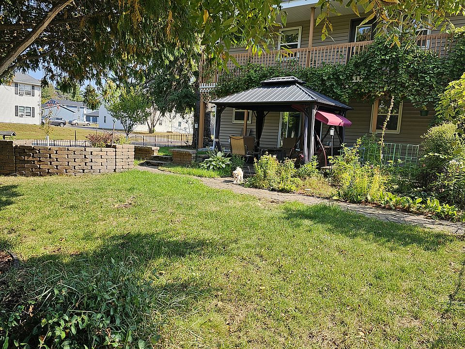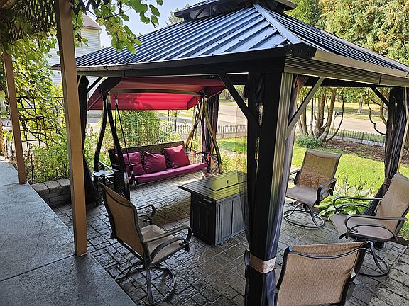 Outside is a serene, canopied patio area surrounded by a lovely flower garden and an enclosed yard, which is further highlighted with a brick semicircular bench next to a brick fire pit.