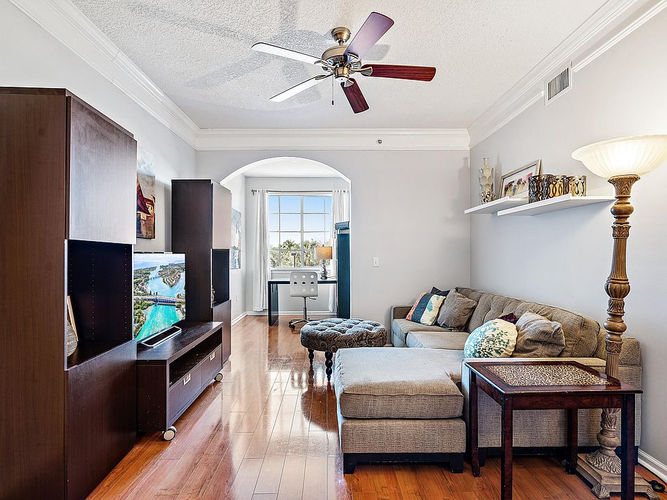 CHARMING, turnkey one bedroom condo located in the gated community of Fiore at the Gardens, with a location central to everything. This beautiful 704 sq ft unit is the ONE you have been looking for! You will immediately fall in LOVE with the freshly painted, open concept living room + office space, dining room, spacious kitchen, and large bedroom with walk-in custom closet. A few other features include an in-unit laundry room, crown molding, and laminate flooring throughout. Furniture negotiable. Completely move-in ready, just in time for season. Perfect for Investors. Fiore at the Gardens is a fabulous community in the BEST location!