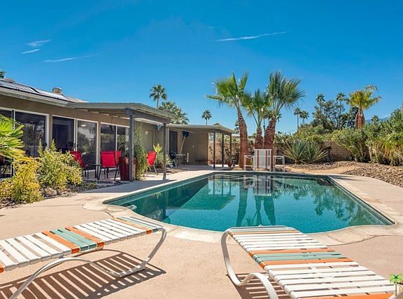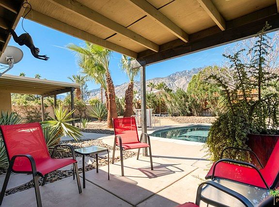 Run . . . Dont walk to this wonderful 4 bedroom/2 bath home with amazing Mt. San Jacinto views and a private salt-water pool heated with a PAID nine-panel solar system. The 10,019 square foot lot features low-maintenance landscaping and is on FEE land (NO LEASE). The double glass entry doors usher you into the living area with an open floor plan and walls of glass from which you will marvel at the view. The very efficient kitchen has been updated with stainless appliances and nice cabinetry. Polished concrete floors throughout the house accompany you from the main living area to the master suite with sliding doors leading you to the private rear yard and pool. There are 3 additional bedrooms one currently used as an office, another as a den and the third is a guest bedroom. Both baths have been updated with new tile showers, quartz vanity tops and fixtures. Less than 2 miles to the heart of Uptown, with fashionable shopping, scores of fine restaurants and social establishments.