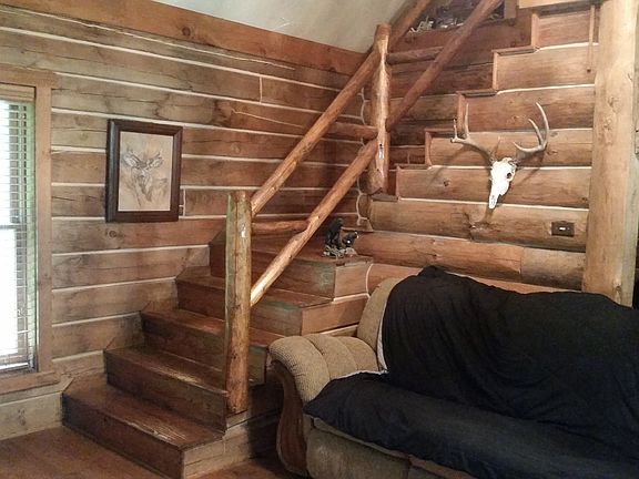 The real thing- Log cabin built in 1989 large loft bedroom up and 2nd bedroom on main level. Two full baths, large open kitchen, dining room and great room. (wood burn stove optional). This log home has wrap around porch. This property is in a secluded area and end of a private community, drive. This property is on city water and sewer. New metal roof. 16x24 barn with lean too small wood shed .New central air. Lots of wild life.