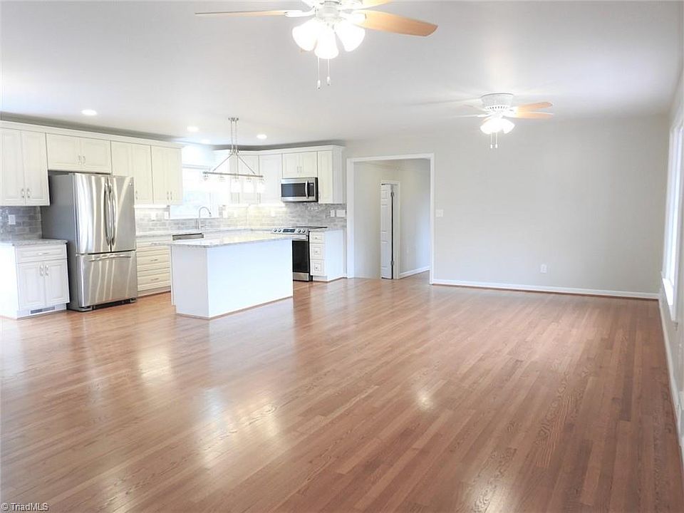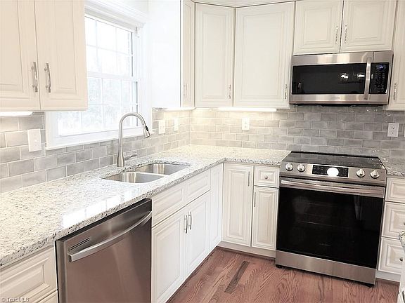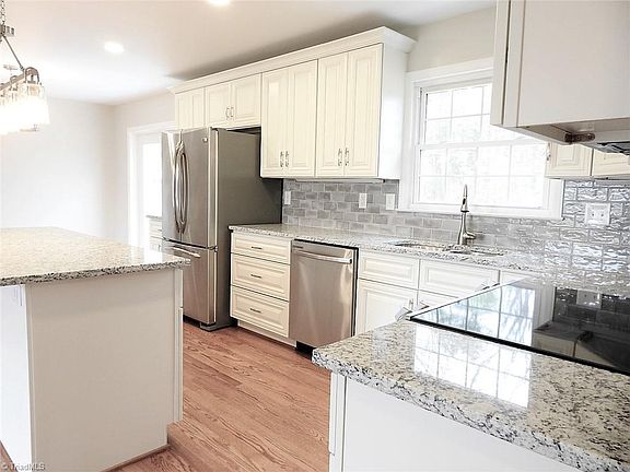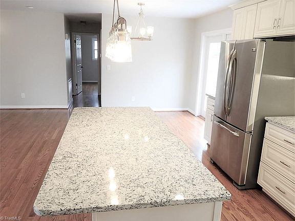Enjoy this gorgeous remodeled brick home in State Road, NC. You will love the open concept kitchen and living room space and a cozy den with a fireplace. You will enjoy beautiful refinished hardwood floors, new custom kitchen cabinets, stainless steel appliances, exquisite granite countertops with an island. New bathrooms with new tubs, sinks, and cabinets. All bright new light fixtures throughout. French doors lead to the new concrete patio and the level backyard. You can work from the home office space which has been added, or this space can be a bonus room. The mudroom and essential pantry storage are located just off the kitchen. New windows, heat pump/central air add to the efficiency of this home. New vapor barrier added and sump pump. Located only minutes from shopping, schools, hiking trails and parks. Car coverage and storage building.