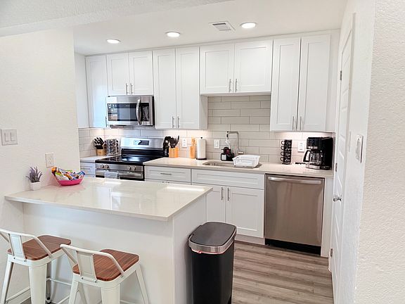 This 3-bedroom, 2-bath vacation home offers a secure, quiet setting with a patio and balcony for relaxing or grilling. Inside, you'll find a fully equipped kitchen, laundry room, dining area, and family room with a 65" Smart TV. The master suite features a king bed, beauty sleep mattress, 55" ROKU TV, and en-suite bath. The second bedroom has a queen bunk bed and Smart TV; the third features two full beds with memory foam mattresses and another Smart TV. Ideal for families and groups, this home provides comfort and entertainment after work or sightseeing.