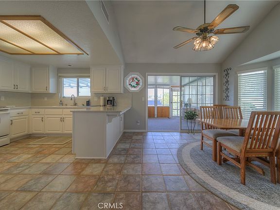 The Upgraded Family Kitchen boasts a breakfast bar, stone countertops, a pantry, and white cabinetry, all adjacent to a Dining Area with 3-sided full bay window walls including cathedral ceilings and a ceiling fan. The home also features White Raised Panel Doors, Wood and Tile floors, ceiling fans and Upgraded Windows throughout. The home is equipped with a Whole House Attic Fan for comfort.