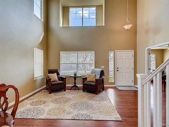Don't miss this open and bright 2-story home with an amazing location in The Villages of Parker/Canterberry Crossing backing to the Black Bear Golf Course with Mountain and City Views. Location, location, location...it doesn't get any better than this! A welcoming front porch, hardwood floors throughout the first level (except laundry room and powder room), fabulous volume created by the 2-story living room and dining room, and fresh paint throughout the first floor (except laundry room) make it a home you will want to see today! The floor plan has seamless flow and front and back stairway access to the upper level. The office/study is well located off the entry and is perfect for working at home. The kitchen, nook, and family room are well integrated and offer a different view from any window you choose including the windows over the kitchen sink! Upstairs, the master suite has a vaulted ceiling, lovely sitting room, and a gas log fireplace shared between the sitting room and bedroom. Well positioned windows provide views from the master bedroom and master bathroom. Two secondary bedrooms share a hall bathroom with double sinks. The basement has a large rec room to accommodate "stay at home' activities, bedroom with egress window, and 3/4 bath. The unfinished area provides lots of great storage. The Villages of Parker have amazing recreational amenities including pool, tennis courts, pocket parks, and trails. There is public access to the Black Bear Golf Course. Schedule your showing today!