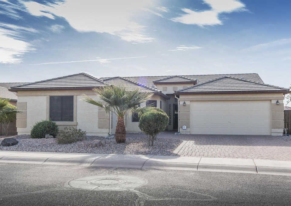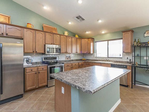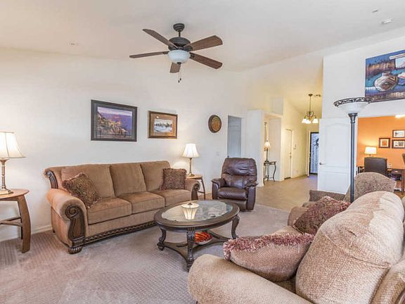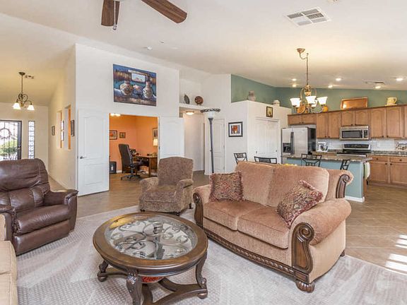 This gently used vacation home offers 4 bedrooms + den with double doors & 2.5 baths in 1977 SqFt with a great room floor plan & split bedrooms. The eat-in kitchen has 42'' maple cabinetry w/crown molding, stainless appliances, subway tile backsplash, island w/breakfast bar & pantry. French doors lead out from the great room & the master bedroom to an extended covered patio w/lots of room for entertaining & low maintenance yard w/desert landscaping & grapefruit, lemon & orange trees. The master bedroom features a private bath w/dual sinks, separate tub & shower and walk-in closet. Two additional bedrooms also have walk-in closets. Other features: 3 car split garage with epoxy floors, storage cabinets and service door, water softener, security system, new interior and exterior paint, newer faucets, paver driveway & much more! Refrigerator, washer & dryer included, too! See today!