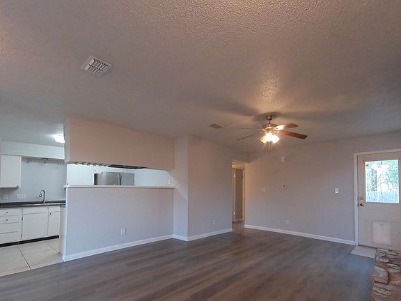 Interior: No carpet flooring at all. Most of the duplex interior painted light gray with white doors and semi-gloss enamel trim. Ceiling fans in both bedrooms and living room. Medium/large doggy door installed in back door to back yard.