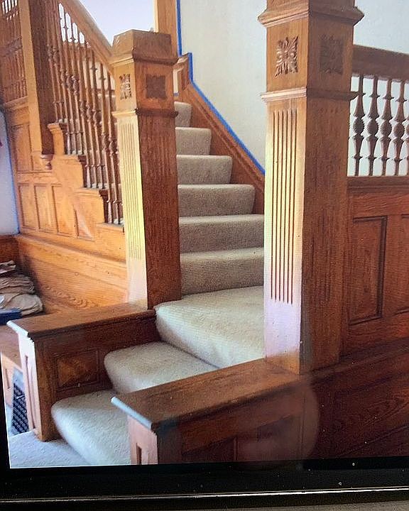 Beautiful home sitting on 5 corner lots. Great neighborhood. Hardwood floors in living, dining and upstairs hallway. I have not checked the bedroom floors. Beautiful fireplace in dining room. Beautiful woodwork on staircase and fireplace. Lots of natural light throughout. Detached double garage.
