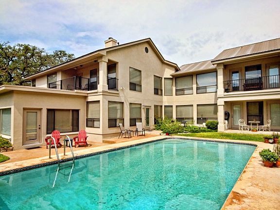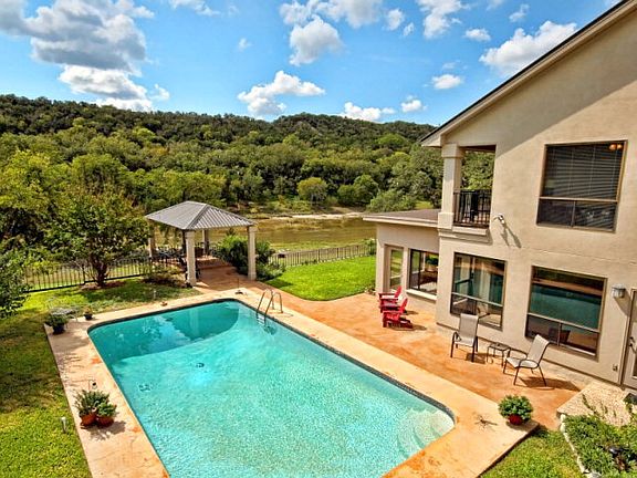 MOTIVATED SELLER! NEW PRICE REDUCTION! Easy access to 164.7 ft. of Blanco River frontage. Complete apartment on 1st floor.3 Bdrms,incl master suite w/private study/or 4th bed.Very large master closet.All beds w/views of river,large pool w/gazebo.2 spacious living areas + 2 dining areas downst w/great river views,+ media room.Upgrades:granite counters in kitchen,light fixtures,water faucets,new air conditioners,radiant barrier in attic & addl insulation. New interior & exterior paint.5 Minutes from downtown Wimberley & 20 min. to San Marcos.