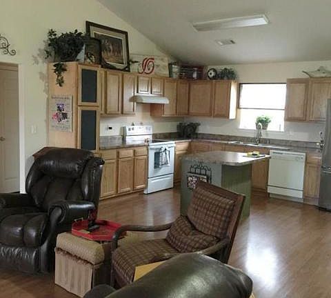 Nice home, large kitchen, cathedral ceiling, 34x6 covered front porch, 16x8 deck, large tree & fruit trees.