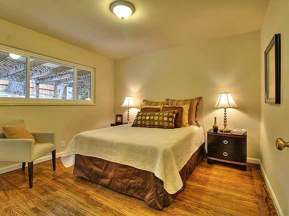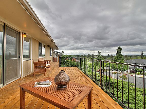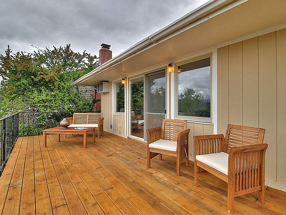 Spectacular view from the new deck & Living room. Plenty of natural light! You will love the possibilities here. Large eat-in kitchen with access to the rear yard/patio area. 2 car detached garage plus plenty of parking off the private drive behind the home. Newly refinished hardwood floors throughout plus fresh paint make this home shine. 3 bedrooms, one of which is a master suite, plus an indoor laundry room too! 2 full baths that have a vintage flair. Double paned windows, newer forced air heating system. This home has a lot of to offer and with a little renovation, it could be stunning! The bones are good, the space is good, just needs a new buyer with some vision. Extra Large lot extends upward from the street, but so many possibilities!