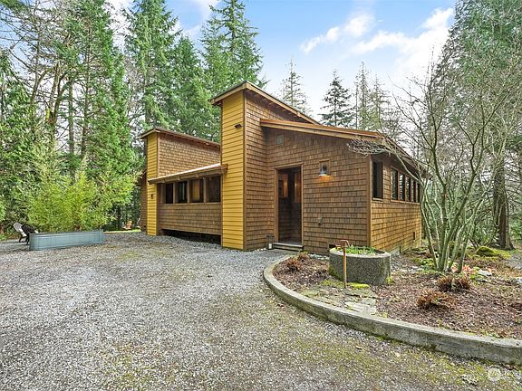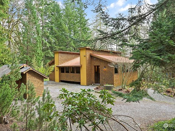 Architectural gem nestled in the woods of Lake Whatcom! This 2bed 1bath 1,260sf home was custom built in 1986 with maximum heating and cooling efficiency in mind. Clad in cedar shingles and standing seam "copper" metal roof, this unique home makes you feel like you're living in a Dwell magazine cabin in the woods. With peak-a-boo lake views and over an acre of land, it feels like you're miles away while still being 15mins to downtown. Home features oak flooring, smooth textured walls, wood wrapped windows and a cozy freestanding fireplace. Abundant storage and character throughout. Small nautical hints and flare found purposely in the design. Truly a one of a kind, well cared for home. Access to hiking trails right out your front door!