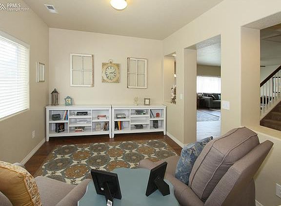 This well-kept home offers an attractive, bright, and open floor plan! * New Roof! * Central Air * Updated flooring on the main level * The spacious eat-in kitchen offers stainless steel appliances, pantry, ample cabinet storage, and touchless kitchen faucet * Living room with ceiling fan and access to under stair storage * Main level also features a flex space that is currently being used as a library but can be utilized as a formal dining room * Sizable master bedroom with an adjoining 5-piece bath and walk-in closet * A spacious loft, three bedrooms, a full bath, and laundry room with a linen closet are also on the upper level. Additional features of this home include central air, recessed lighting, 9 ft ceilings, a security system, and a Xeriscaped backyard with a 10 x 10 Patio. Minutes from Peterson Air Force Base and conveniently located near shopping and restaurants and the new King Soopers grocery store to be opening soon!